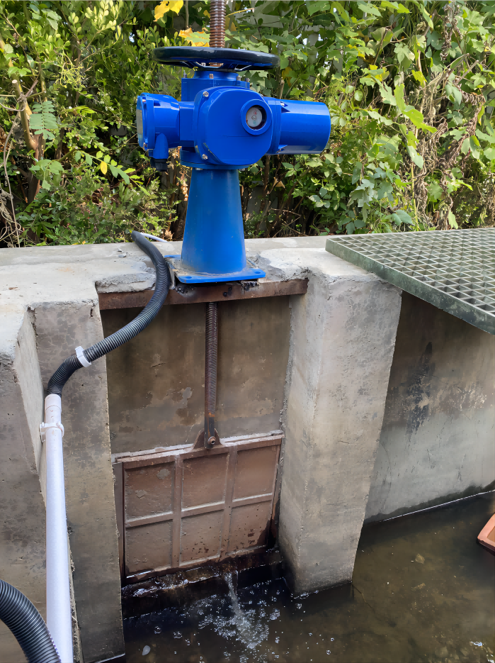 此處為手動圓盤式閘閥,改造需要把閘桿更換加裝電機,改造閘門可以遠程聯動控制啟閉。三個閘閥共用一個控制柜,節省成本,方便管理,安裝在泵房內,不易破壞。泵房內,兩臺25kw的水泵控制直接啟動,為實現自動化及保護水泵,采用軟啟動控制柜,更穩定,不容易出故障。