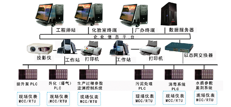 城市污水處理廠自動控制系統(tǒng)采用計算機十PLC+現(xiàn)場儀表構(gòu)成的分布式控制系統(tǒng)。系統(tǒng)設(shè)置一個中央控制室PLC站和現(xiàn)場PLC控制站,分為管理層(中控室操作員站)、控制層(PLC控制站)和執(zhí)行層(現(xiàn)場測量儀表、執(zhí)行機構(gòu))。中央控制室與現(xiàn)場控制站之間通過工業(yè)以太網(wǎng)(或工業(yè)總線)形式通訊。