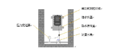 將防水外罩安裝在監測井井壁上,微功耗測控終端放置在防水罩內。壓力變送器信號線、水表信號線接在微功耗測控終端自帶的防水接線盒上。