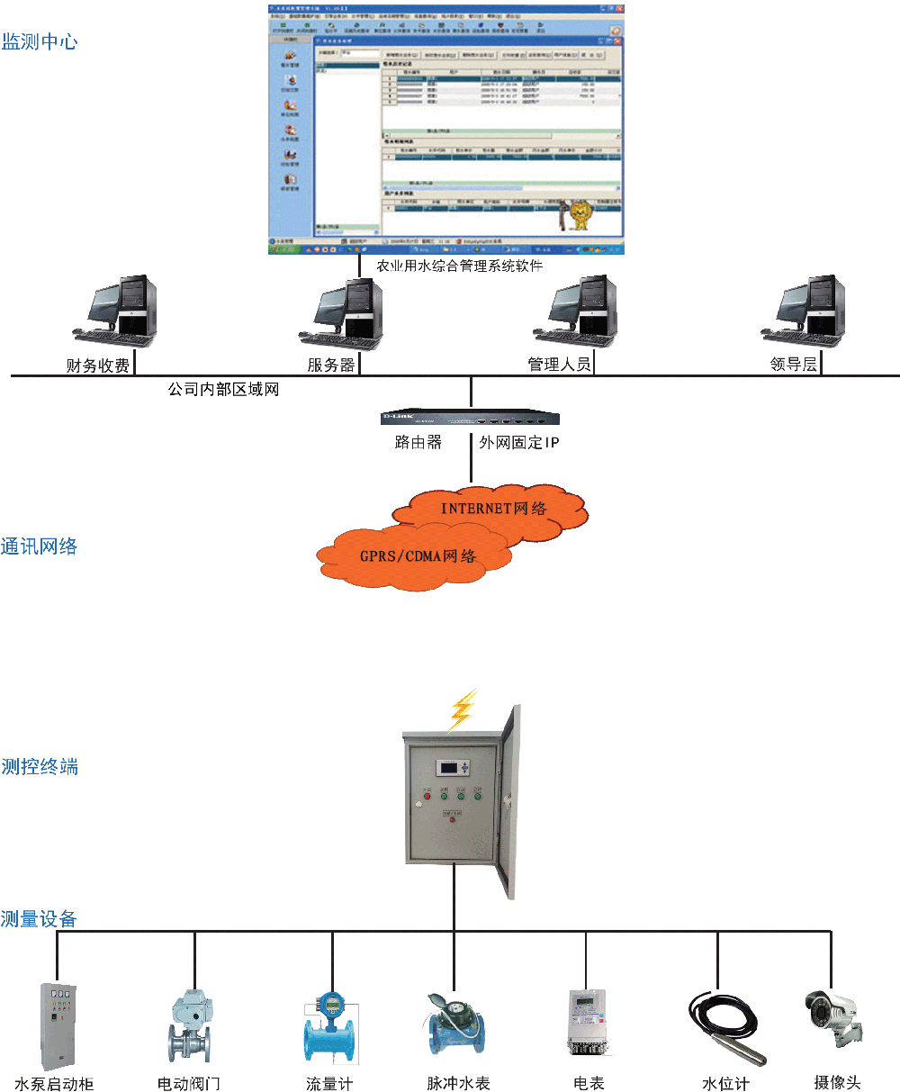 一、系統簡介 農業用水綜合管理系統中機井灌溉IC卡收費控制是該系統的核心,它將機井灌溉控制器、交流接觸器以及配電設備安裝在一個機箱內,可以采集灌溉用電量、用水量或灌溉時間并自動收取灌溉費用。農田機井灌溉收費控制箱不僅使管理部門實現了先收費、后灌溉的管理目標;也使農戶達到了借助IC卡自主澆地的目的。同時也成功解決了農業機井灌溉管理中長期存在的電費/水費計量不準、拖欠灌溉費用和浪費水資源的難題。 二、系統組成 v 監控中心:中心服務器、外網固定IP、水資源管理系統軟件、收費管理系統軟件; v 通信網絡: 基于移動無線GPRS或電信無線CDMA網絡; v 采集控制終端:IC卡控制終端、GPRS/CDMA DTU; v 計量儀表:流量計/水表/電表、水泵控制柜/電動閥門。