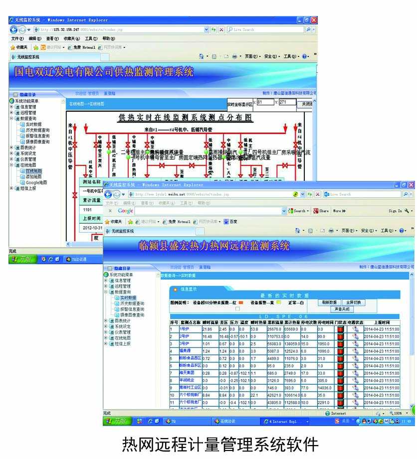 三、系統功能 v 供熱蒸汽的實時用量監測:累計流量、剩余流量、熱量、壓力、溫度、頻率、差壓等; v 供熱熱水的流量、壓力、溫度監測; v IC卡預收費管理功能; v 支持遠程閥門的控制功能; v 支持多種廠家積算儀組網; v 支持停電報警,停電來電自動上報到監控中心; v 支持測控箱門開關狀態報警功能; v 支持現場抓拍圖像; v 數據采集和信息查詢功能; v 生產各種數據統計報表、歷史曲線報表、導出和打印功能數據異常自動聲光報警功能; v 短信通知功能:剩余量提醒、報警信息通知到相關人員手機。 現場圖片  |